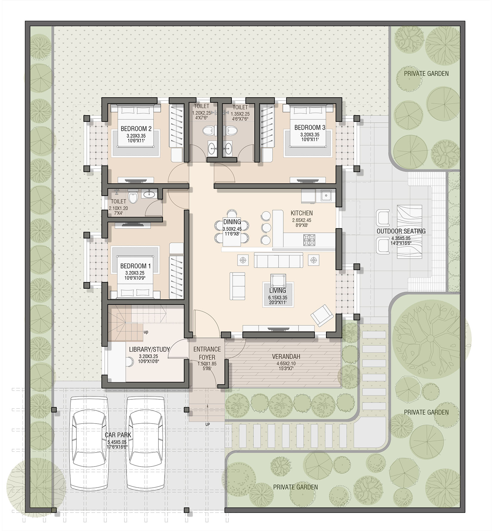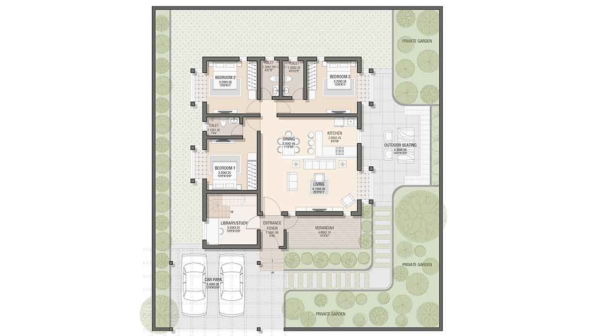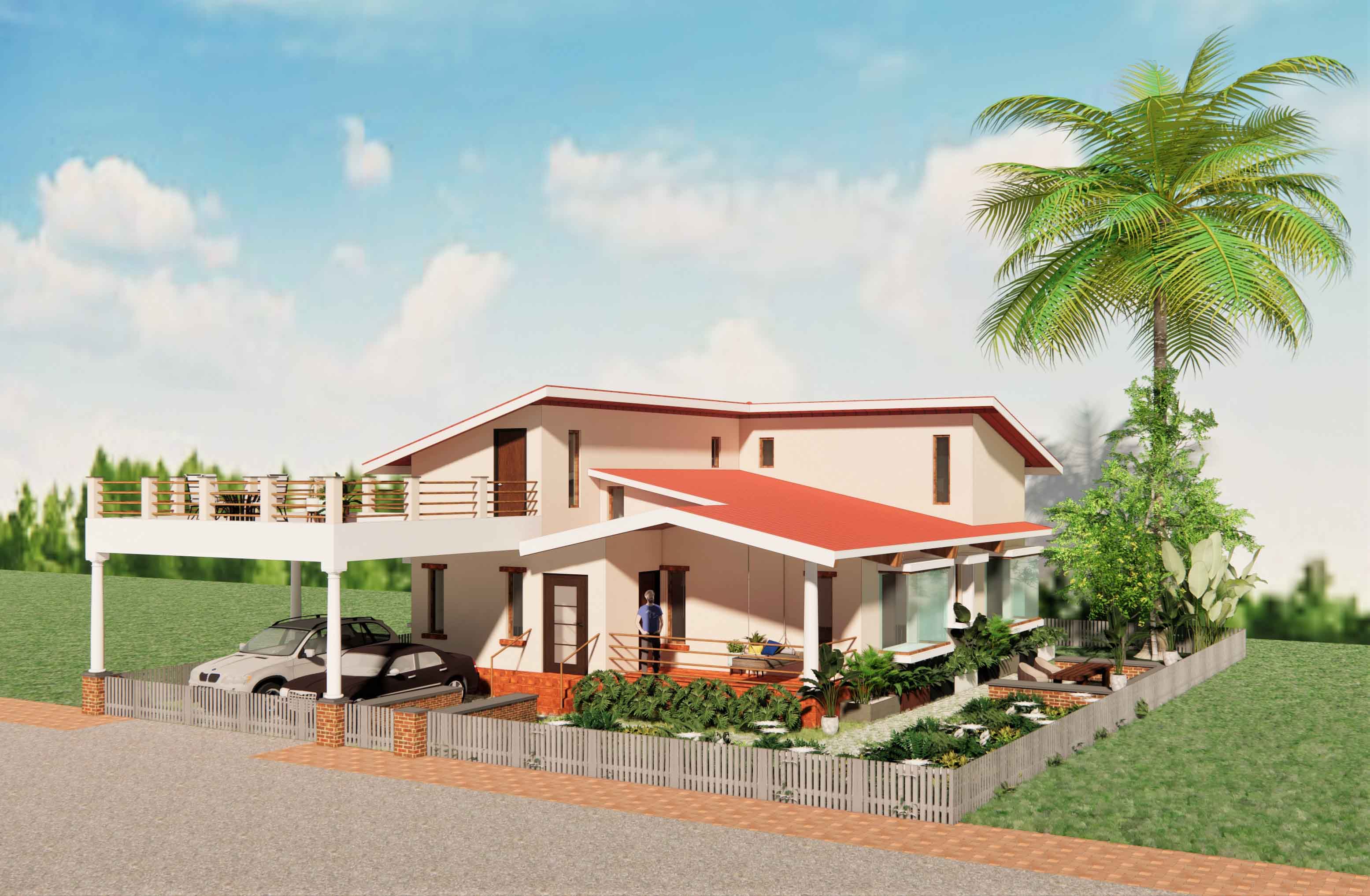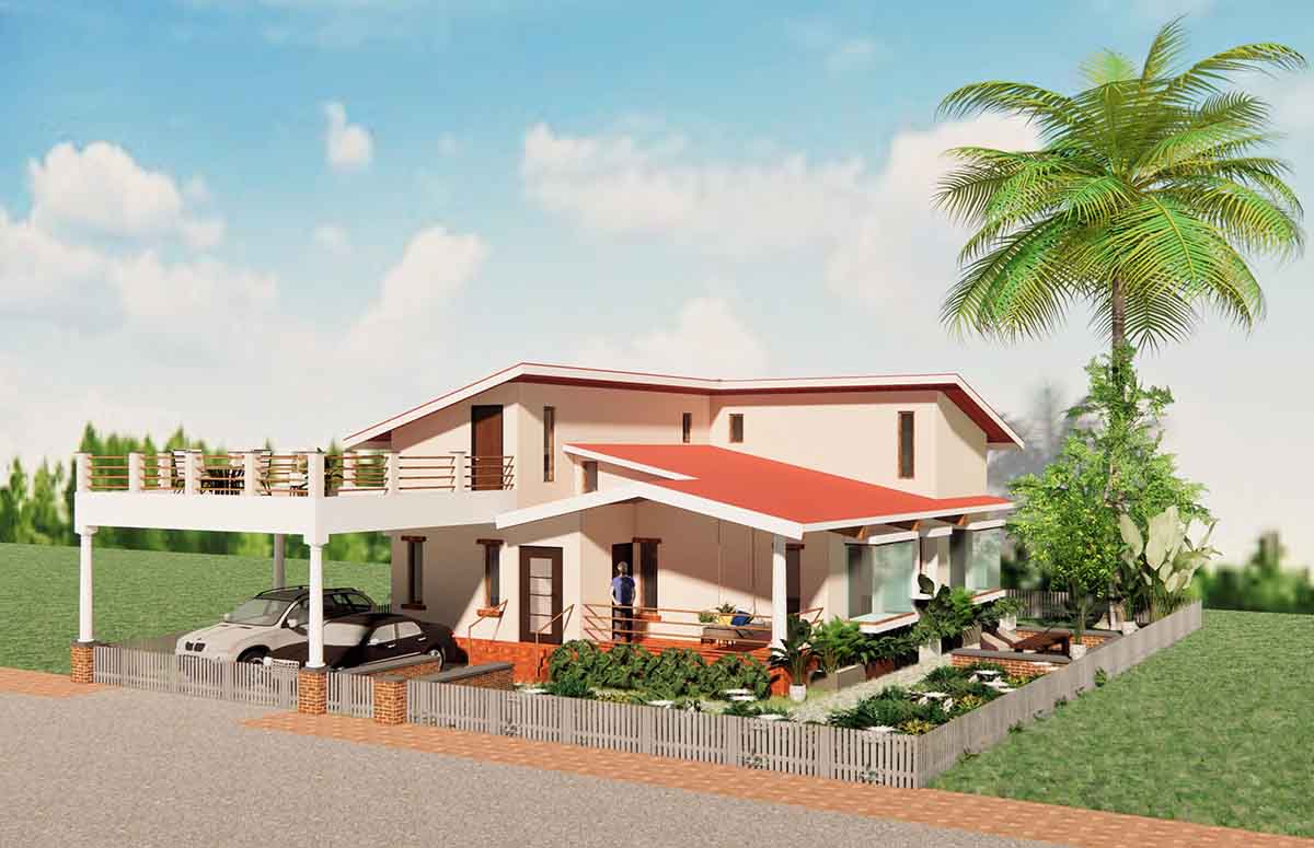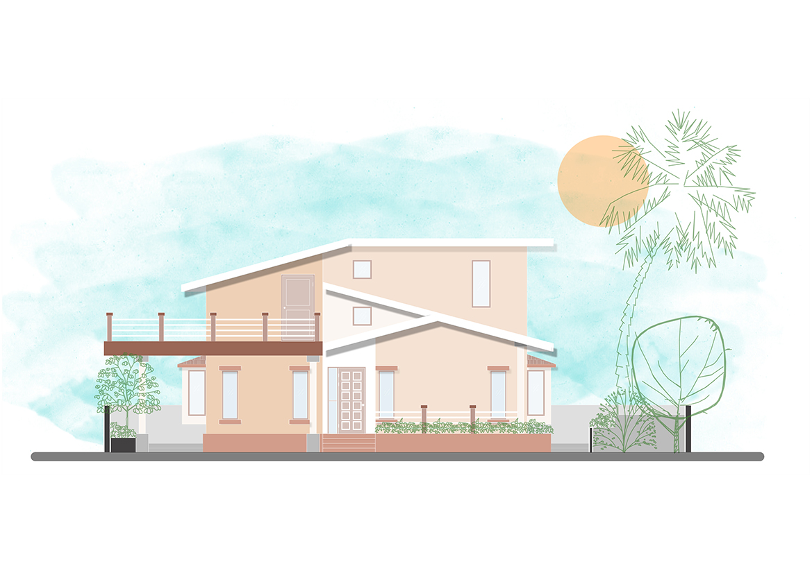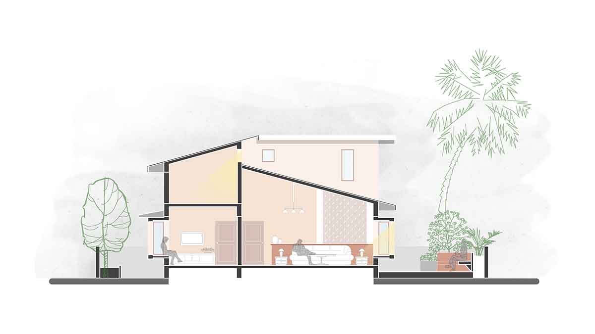 Khan House is a small family home aimed to accommodate a family of three. The site is a large 6-acre farmland situated in a small town in Maharashtra. The house is proposed to be located on the highest most point of the contoured piece of land to overlook the plantations and small patches of farms. The house is divided in 3-parts: central living room that acts as a common area with an open kitchen type setting, three bedrooms hugging the living room on two sides and an outdoor seating area. The verandah acts as an entrance lobby to the house along with a front porch that can be used for parking or a covered sitting space. The front porch is designed to contain a small terrace accessible from the attic, to act as a machan for a panoramic view of the farmland.